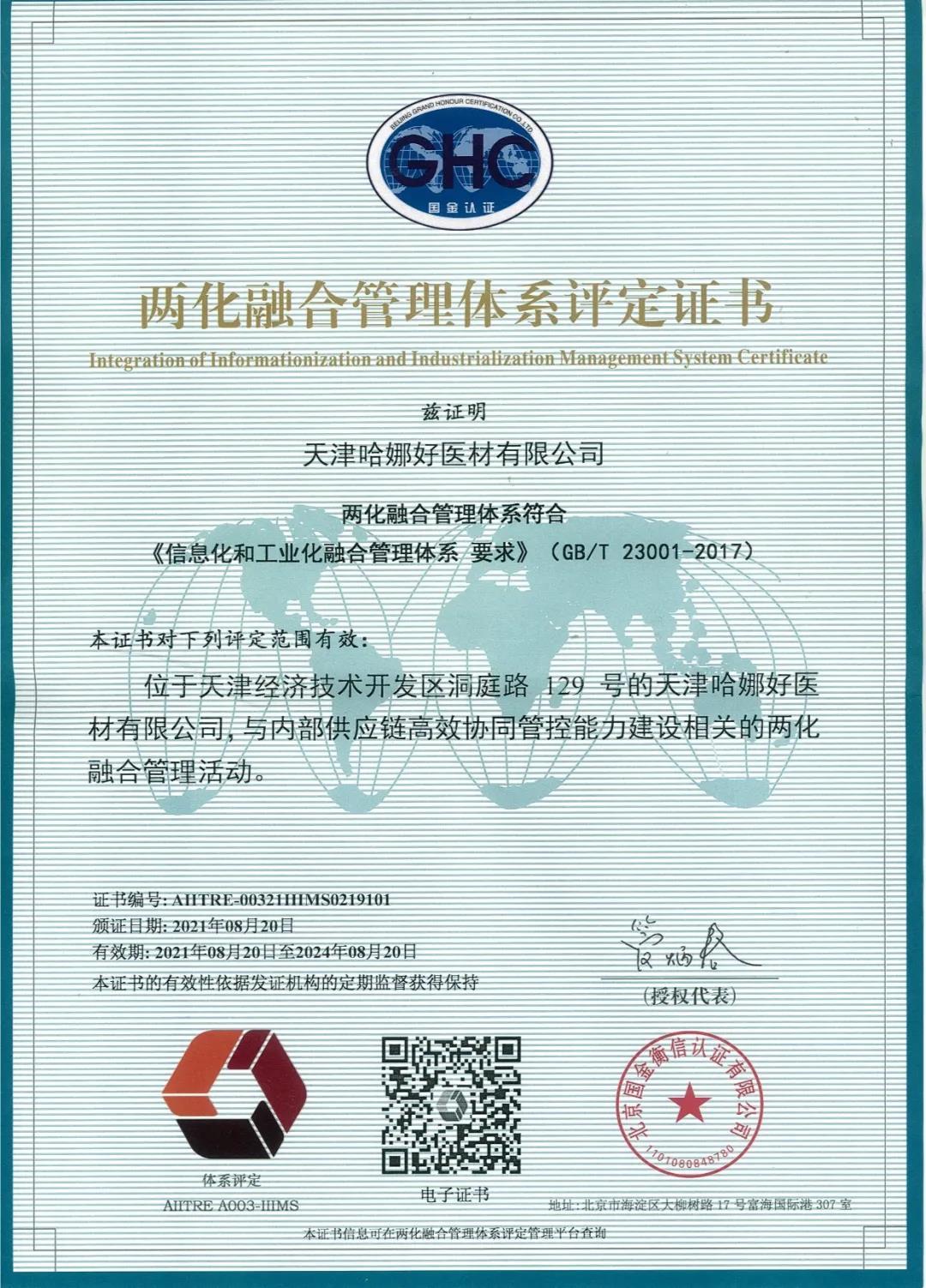 喜訊 | 天津哈娜好醫(yī)材有限公司榮獲“兩化融合管理體系評(píng)定證書(shū)” 近日,天津哈娜好醫(yī)材成功通過(guò)兩化融合管理體系貫標(biāo)評(píng)定,獲得由國(guó)家工信部授權(quán)的評(píng)定機(jī)構(gòu)——北京國(guó)金衡信認(rèn)證有限公司頒發(fā)的“兩化融合管理體系評(píng)定證書(shū)”,這標(biāo)志著天津哈娜好在推進(jìn)信息化和工業(yè)化深度…