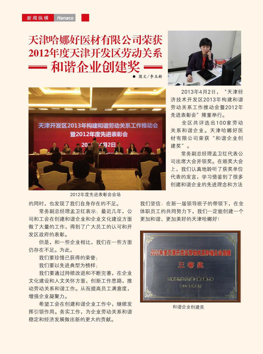 天津哈娜好醫(yī)材有限公司榮獲2012年度天津開發(fā)區(qū)勞動關(guān)系—和諧企業(yè)創(chuàng)建獎